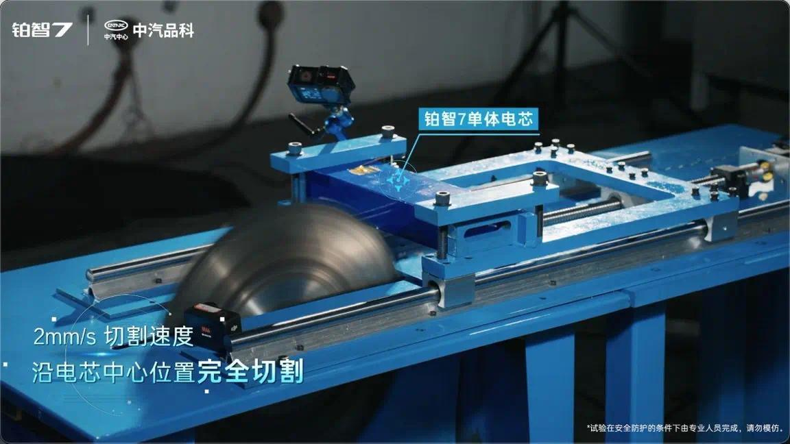 在最具挑战性的电芯全截面切割测试中,测试电芯覆盖全新及等效行驶超30万公里老化状态,均实现切割后温度无异常升高、静置24小时不起火、不爆炸。这得益于铂智7采用高稳定性磷酸铁锂正极、低活性电解液、超高分子量安全隔膜及贴片保险丝等材料与设计,构建起电芯本征安全与电池包热扩散防护的双重屏障。